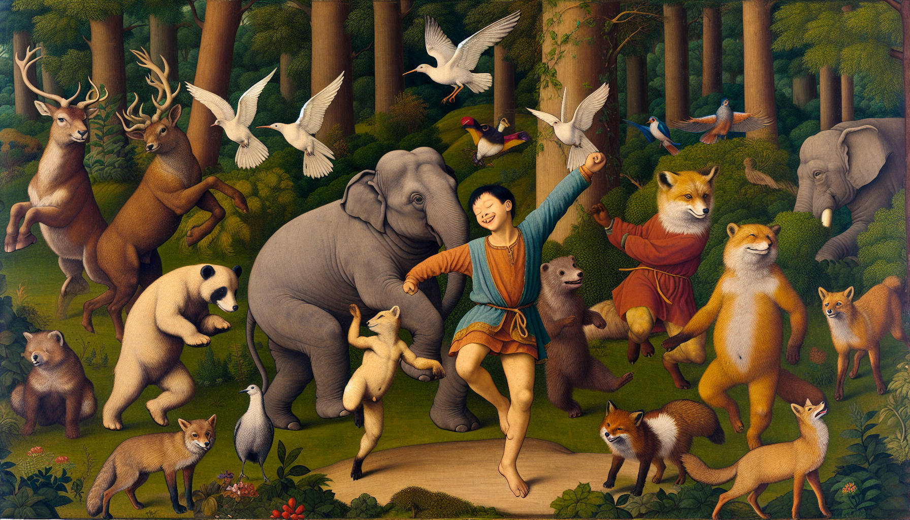Es war einmal ein kleiner Junge namens Tim, der in einem kleinen, bunten Dorf am Rand eines großen, geheimnisvollen Waldes lebte. Tim war ein fröhlicher und neugieriger Junge, der es liebte, Abenteuer zu erleben und die Natur zu erkunden. Eines Tages, als die warmen Sonnenstrahlen durch die Bäume strahlten und die Vögel fröhlich zwitscherten, hatte Tim eine wunderbare Idee. Er wollte ein großes Tanzfest für all seine tierischen Freunde im Wald veranstalten.
